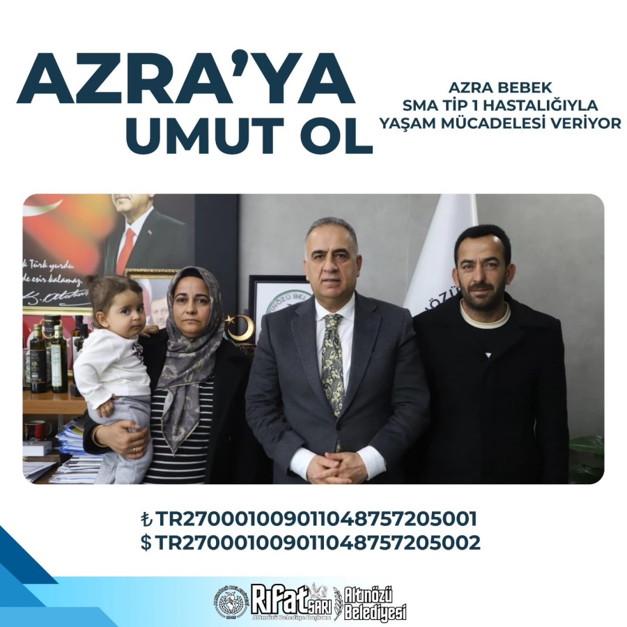 Altınözü Belediye Başkanı Rıfat Sarı, SMA Tip 1 hastalığıyla mücadele eden Azra Öztürk bebek için destek çağrısında bulundu. Başkan Sarı, Azra bebeğin tedavisi için toplumun her kesimini dayanışmaya davet etti. Başkan Sarı, “SMA Tip 1 hastalığıyla yaşam mücadelesi veren Azra Öztürk bebeğimiz için hep birlikte el ele verme zamanı. Birlik olalım, Azra bebeğimizin umudu olalım” ifadelerini kullandı.